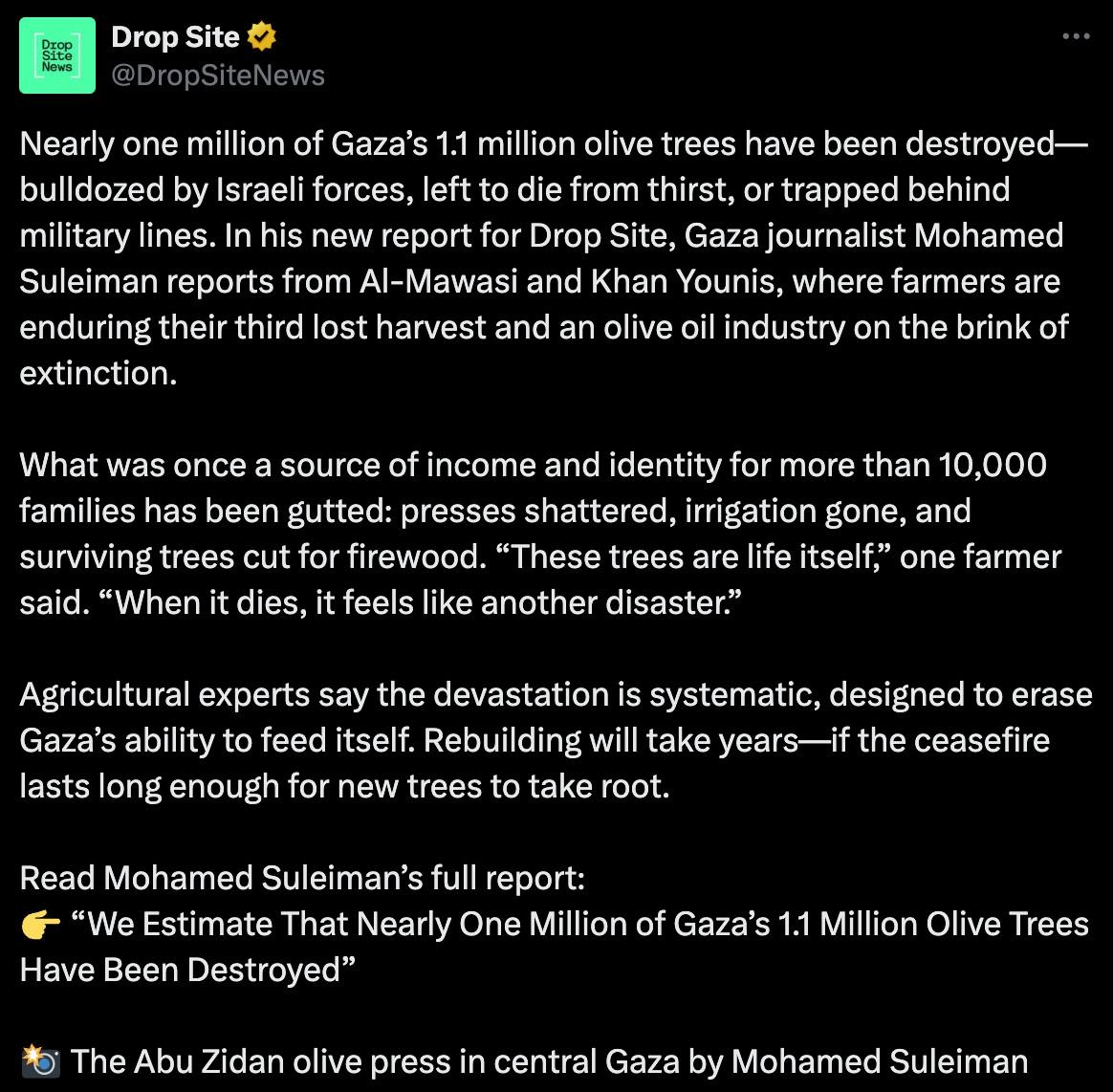 Nearly one million of #Gaza’s 1.1 million olive trees have been destroyed—bulldozed by Israeli forces, left to die from thirst, or trapped behind military lines. Gaza journalist Mohamed Suleiman reports from Al-Mawasi and Khan Younis.